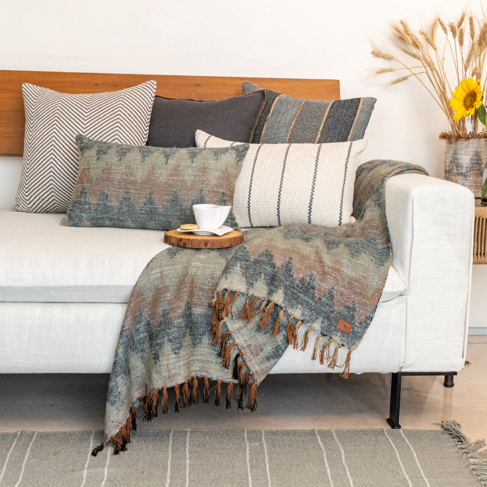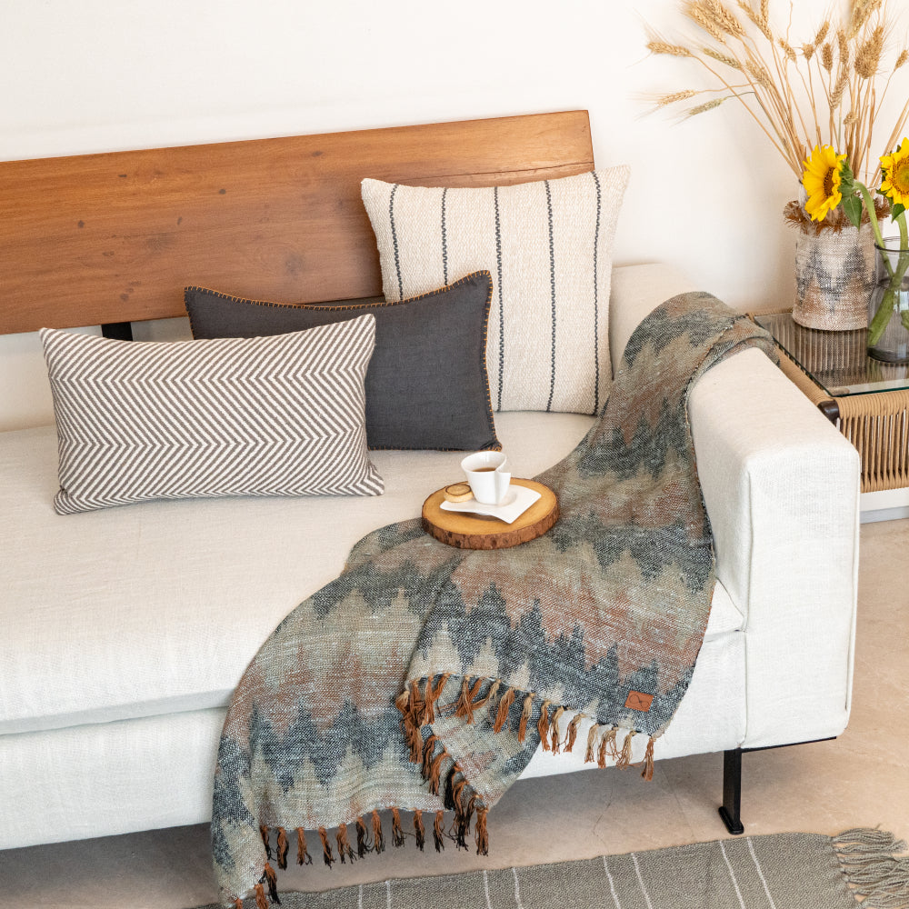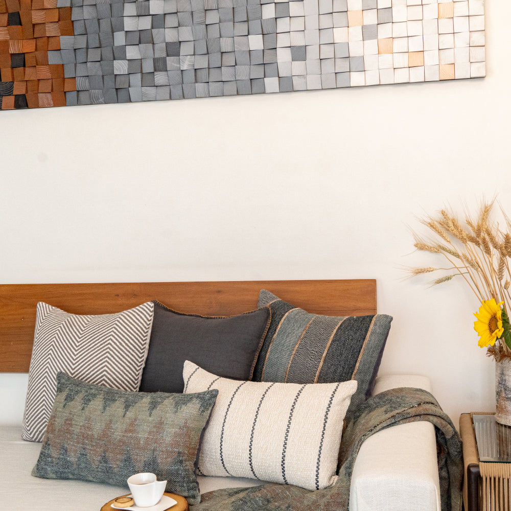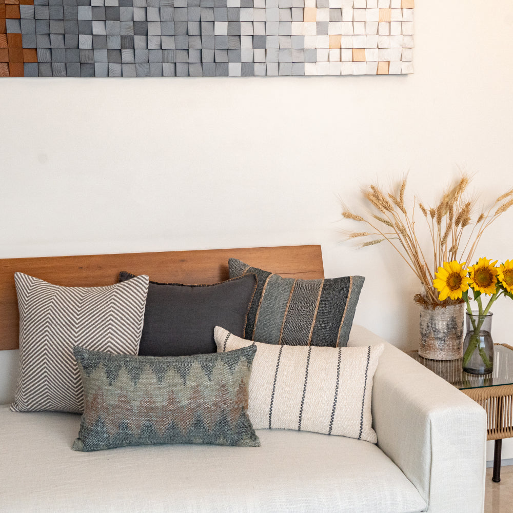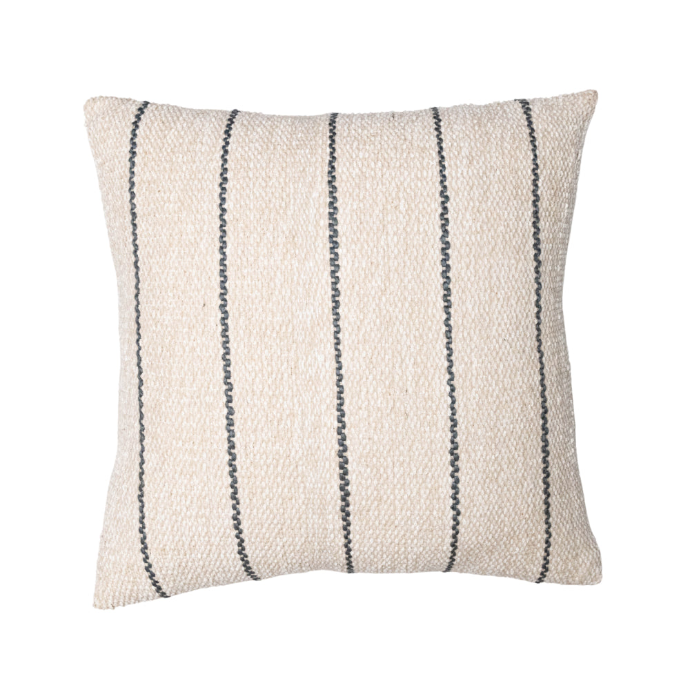 Prana grey cotton cushion cover is handwoven with love by a township of master artisans. Introduce a fresh perspective on pattern with this boho, white and grey stripe, textured pillow, because less is more! Minor variations in colour and weaving are intrinsic to our crafting process and gives these accents a unique character.